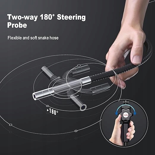 W przeciwieństwie do innych endoskopów, nasza unikalna konstrukcja pozwala na zginanie kamery endoskopowej o 180°. Średnica kamery 8,5 mm, rozdzielczość 1080P, 8 wbudowanych regulowanych lamp LED. Nie przegapisz żadnych szczegółów nawet w ciemnych lub słabo oświetlonych warunkach. Wskazówki: Korpus nie jest wodoodporny, a sonda jest wodoodporna IP68.