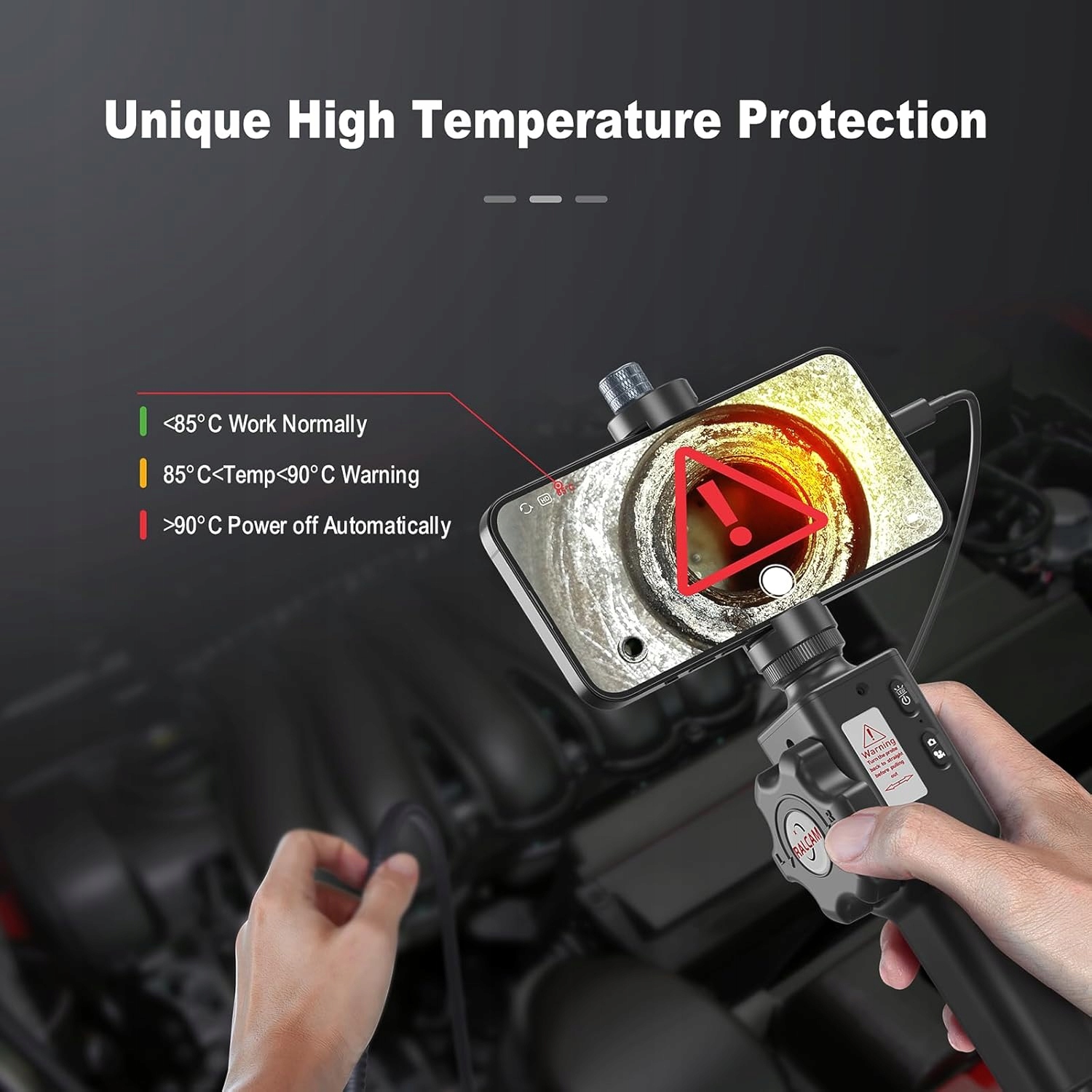 Temperatura robocza: -10°C do +90°C. Unikalna technologia ochrony przed temperaturą opracowana specjalnie dla profesjonalnych endoskopów przemysłowych, może pracować w trudnych warunkach. Jeśli temperatura przekroczy 90 stopni, urządzenie wyłącza się automatycznie i chroni.