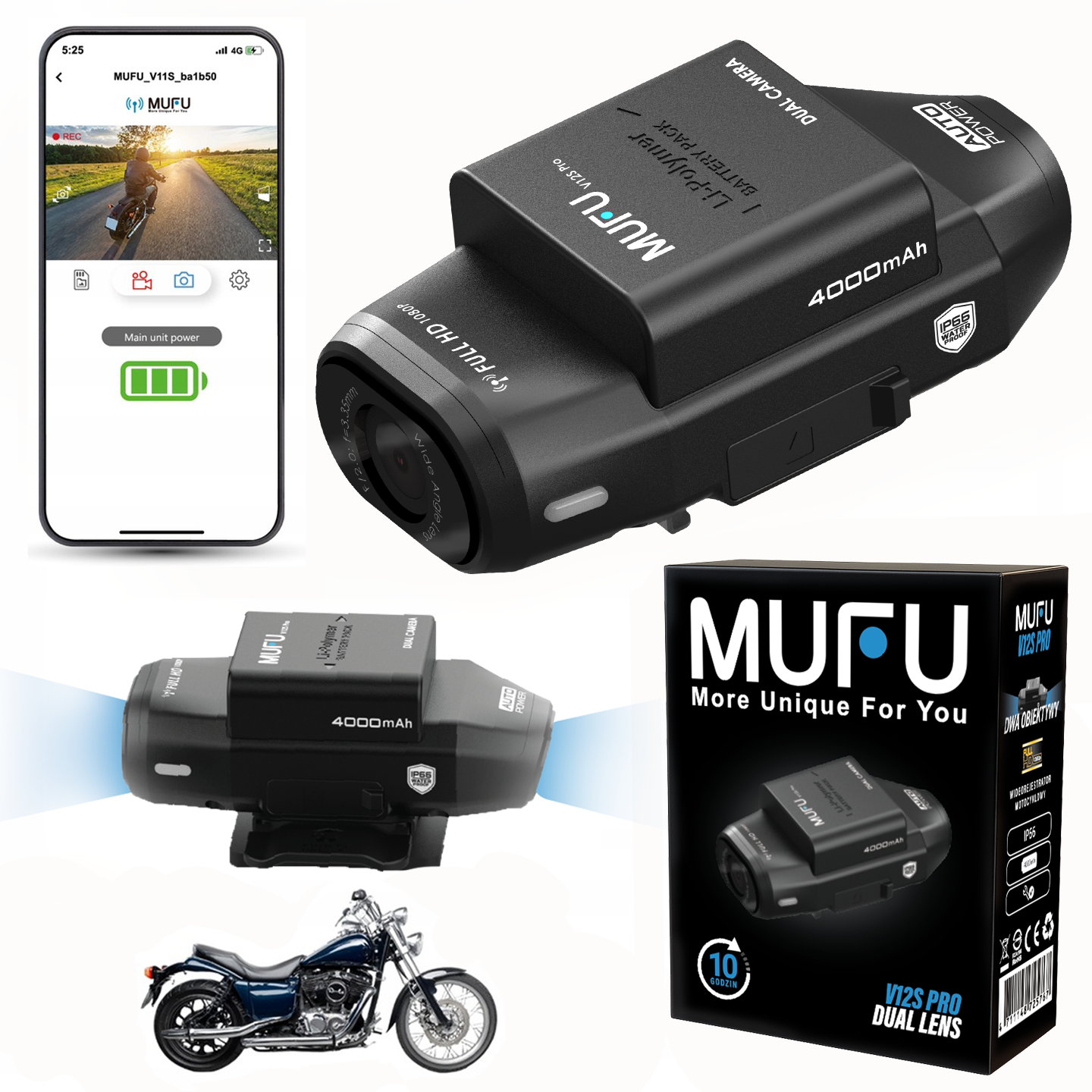 MUFU V12S Pro to nowoczesny wideorejestrator motocyklowy stworzony dla pasjonatów dwóch kółek, którzy cenią bezpieczeństwo, jakość nagrań i niezawodność. Dzięki dwóm kamerom Full HD, WiFi i wodoodpornej konstrukcji IP66, uchwycisz każdy moment jazdy – zarówno z przodu, jak i z tyłu.