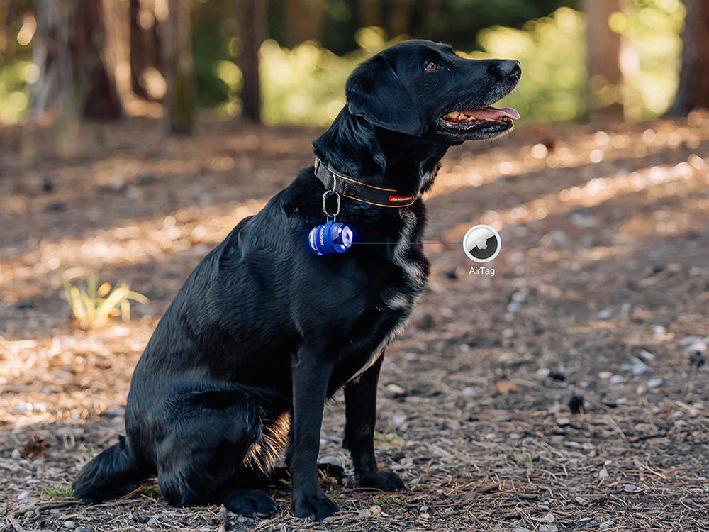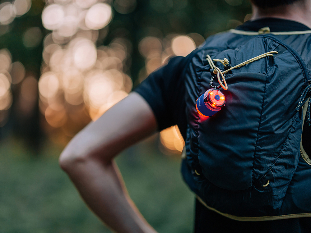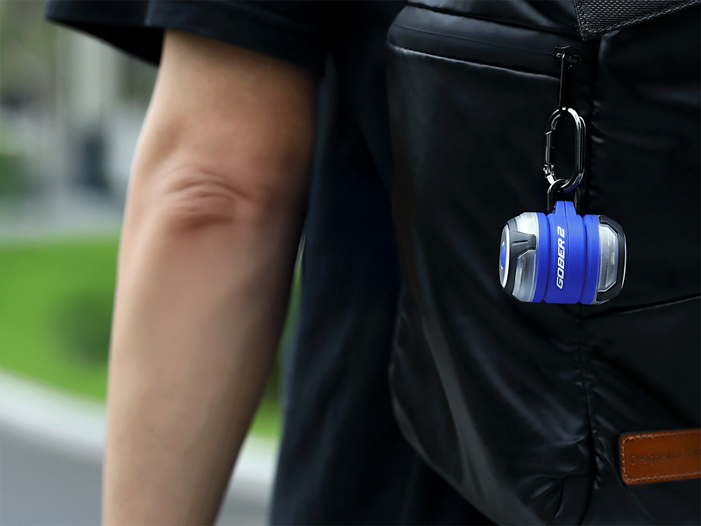 Konstrukcja została wykonana z trwałego tworzywa sztucznego o klasie szczelności IP55, co gwarantuje odporność na kurz i zachlapania. Wbudowany uchwyt na AirTag i karabińczyk pozwalają przypiąć lampę do plecaka, bagażu, smyczy lub obroży psa, co zwiększa bezpieczeństwo i widoczność po zmroku.