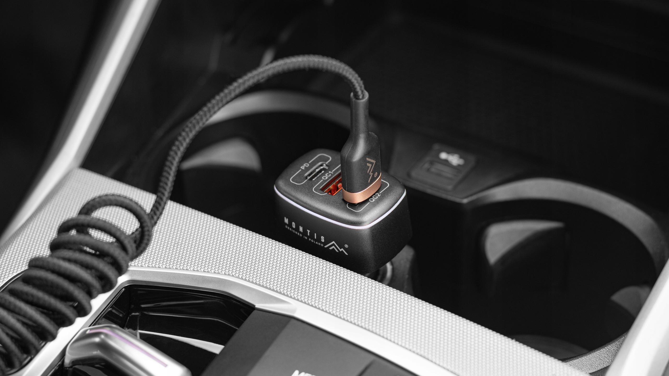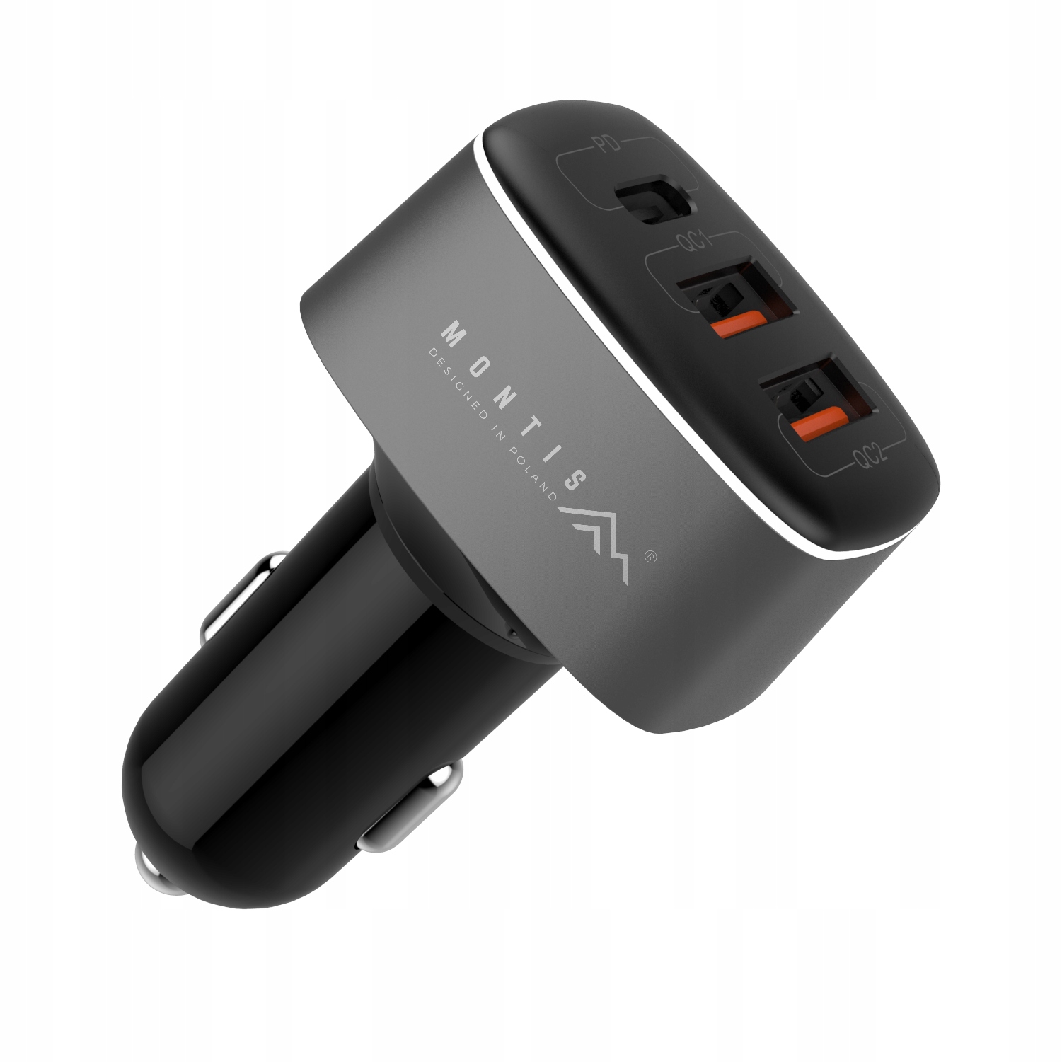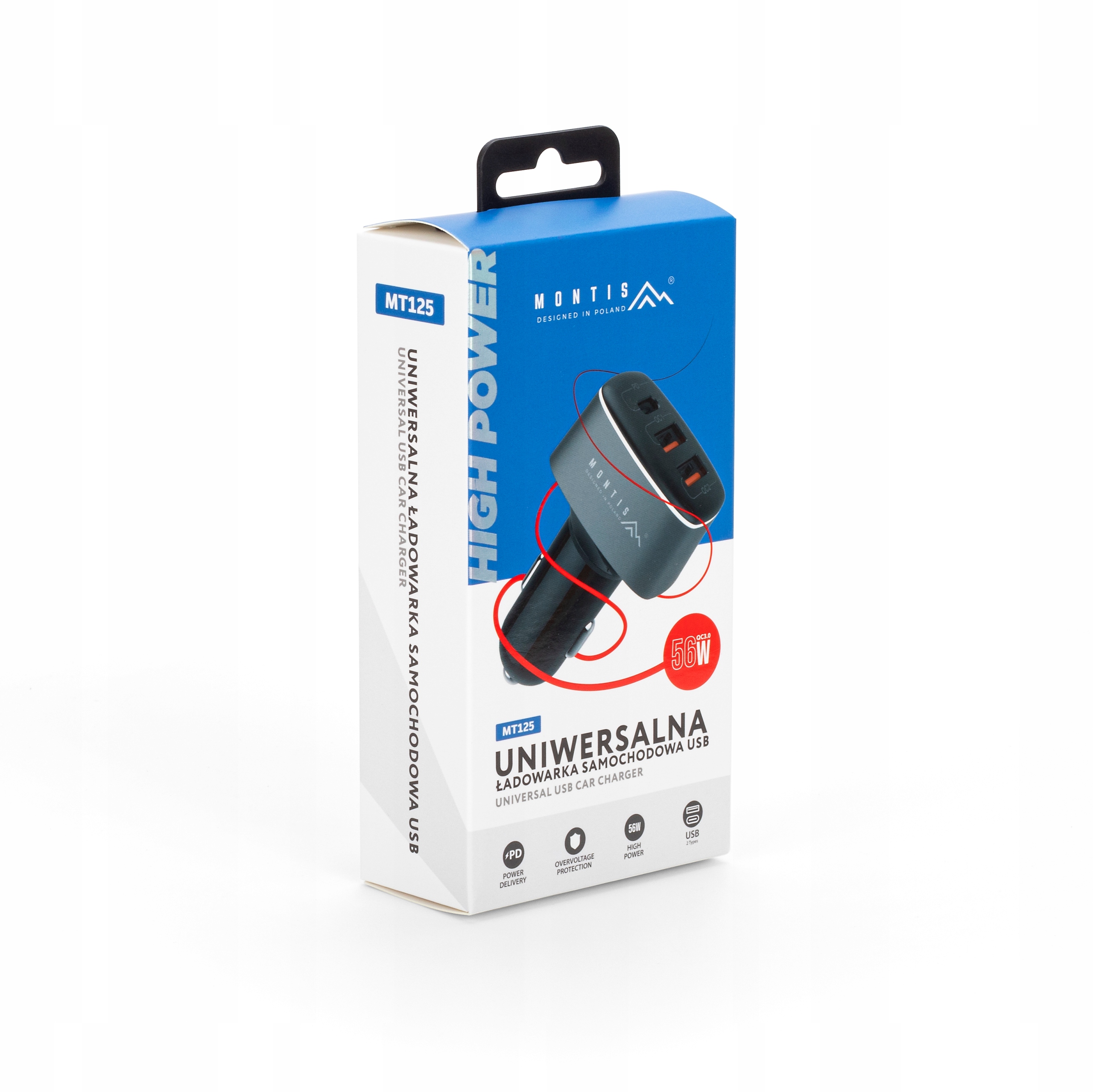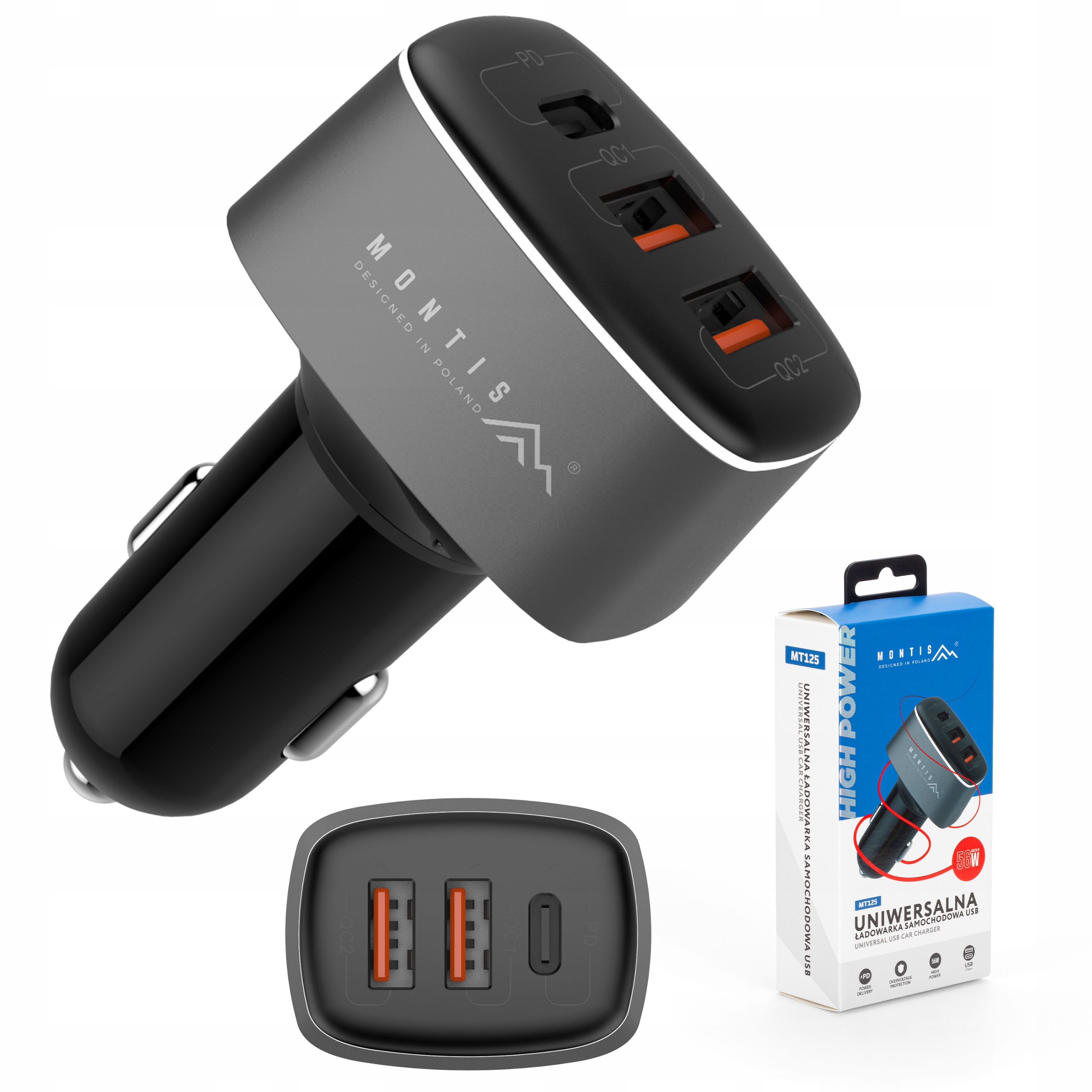 Ładowarka samochodowa MT125, zaprojektowana do efektywnego ładowania w trudnych warunkach samochodowych, oferuje trzy wyjścia USB: jedno typu C z technologią Power Delivery oraz dwa typu A z Quick Charge 3.0, zapewniając łączną moc 56W.