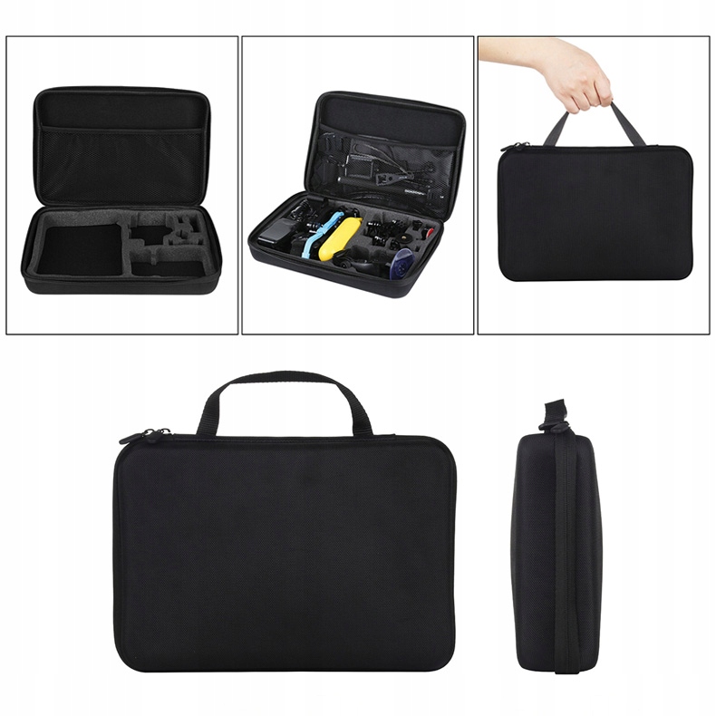 Akcesoria umieszczone są w trwałej walizce wykonanej z materiałów odpornych na uszkodzenia i zużycie. Zapewnia ona wygodne i bezpieczne przechowywanie sprzętu, a dzięki dużej pojemności bez trudu zmieścisz w niej kamerę sportową, obudowę oraz wszystkie dodatki.