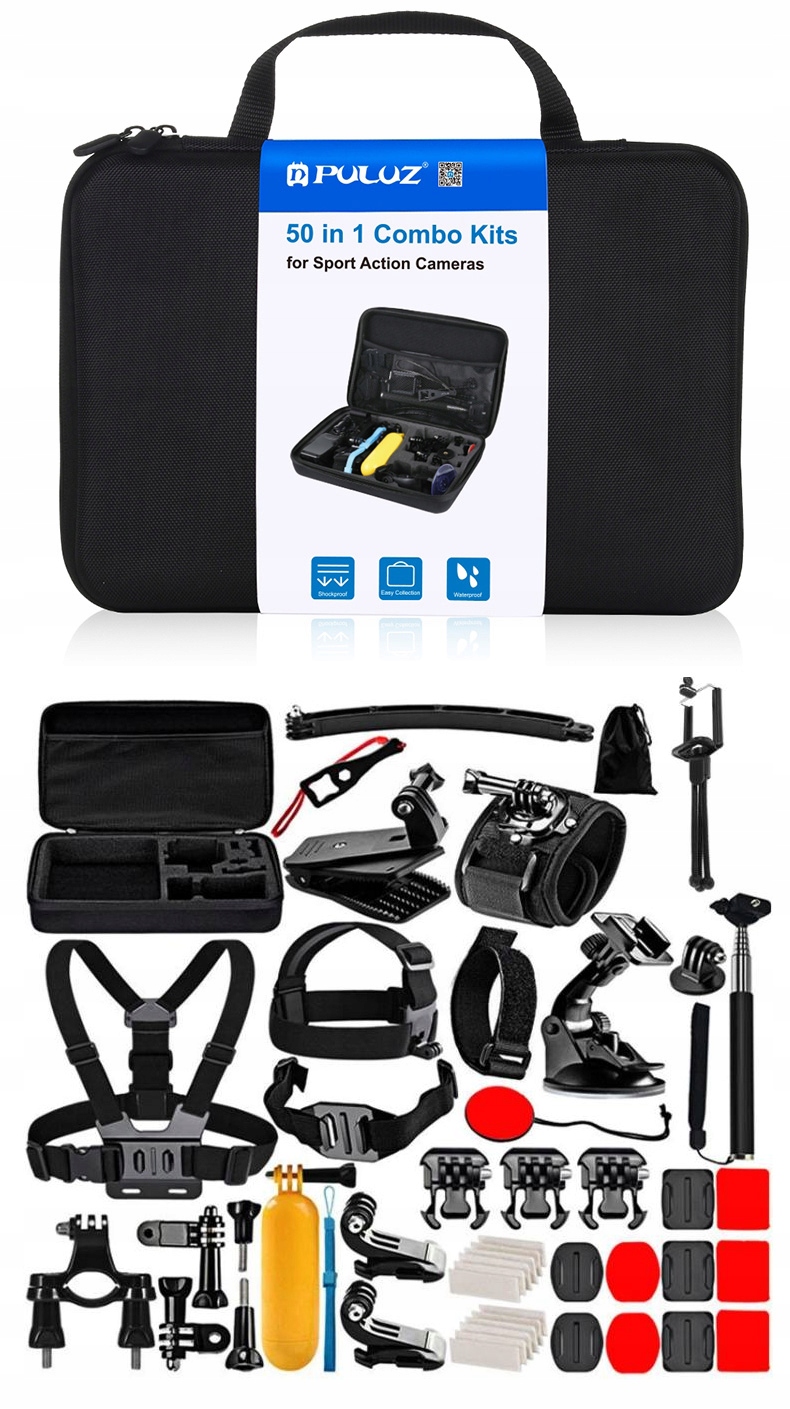 Zestaw akcesoriów 50 w 1 marki Puluz to kompletne wyposażenie dla użytkowników kamer sportowych. W skład pakietu wchodzą różnego rodzaju uchwyty i opaski, praktyczne adaptery i mocowania, podkładki samoprzylepne, a także statyw i kijek do selfie. Całość zapakowana jest w pojemną, solidną walizkę ułatwiającą przechowywanie i transport. Akcesoria są kompatybilne z wieloma popularnymi kamerami sportowymi, w tym modelami GoPro czy DJI, dzięki czemu nie musisz kupować każdego elementu oddzielnie.