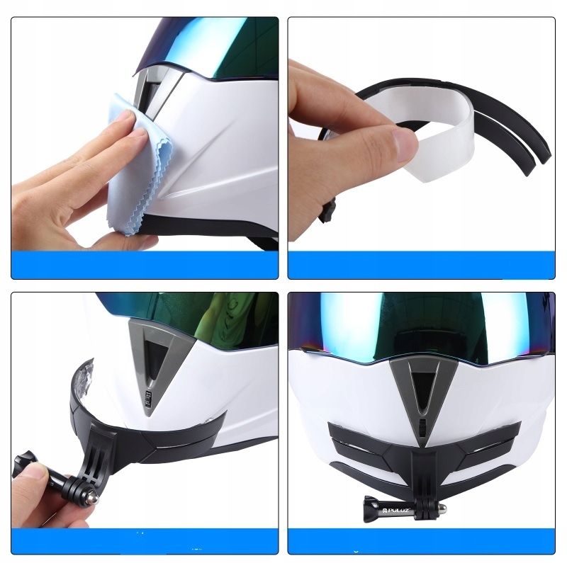 Przed przyklejeniem uchwytu należy starannie oczyścić powierzchnię kasku. Pełną przyczepność uzyskuje on po 3–5 godzinach od zamocowania, co pozwala klejowi odpowiednio się związać.