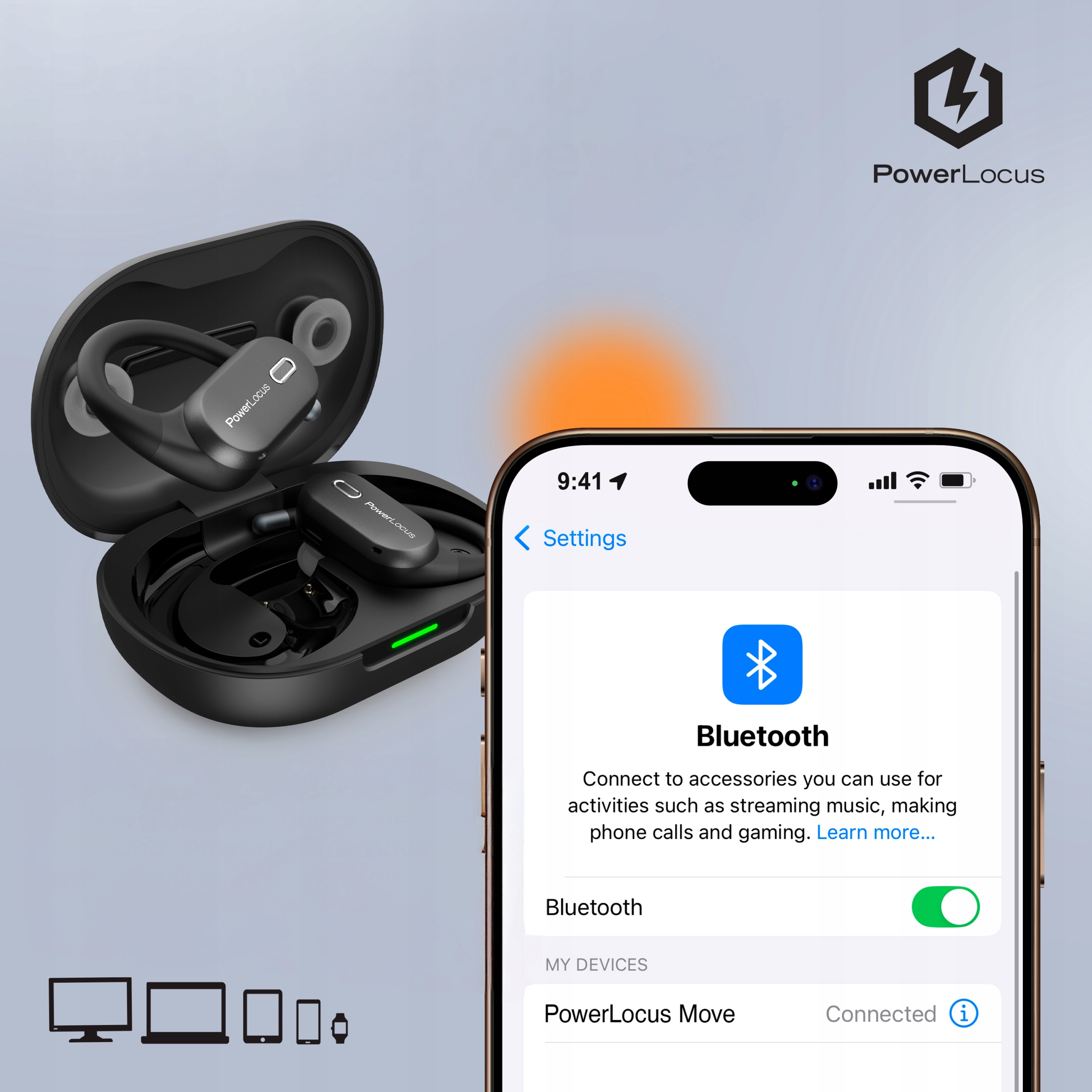 PowerLocus Move to innowacyjne słuchawki Open-Ear, które zapewniają głębokie brzmienie z mocnym basem, jednocześnie pozwalając Ci pozostać świadomym otoczenia.