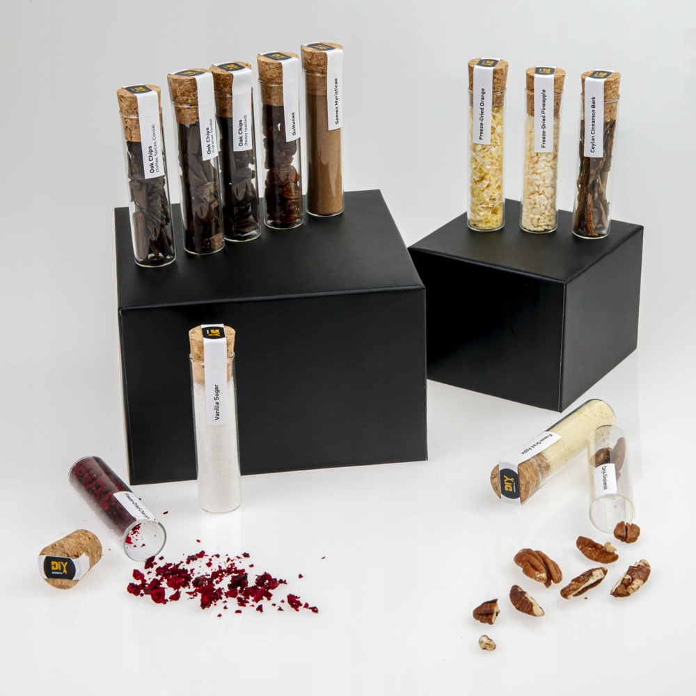 Odkryj wyjątkowy zestaw przypraw do aromatyzowania rumu, który pozwoli nadać trunkowi indywidualny charakter. W komplecie znajduje się 12 starannie dobranych składników, zamkniętych w 12 szklanych fiolkach o pojemności 20 ml.