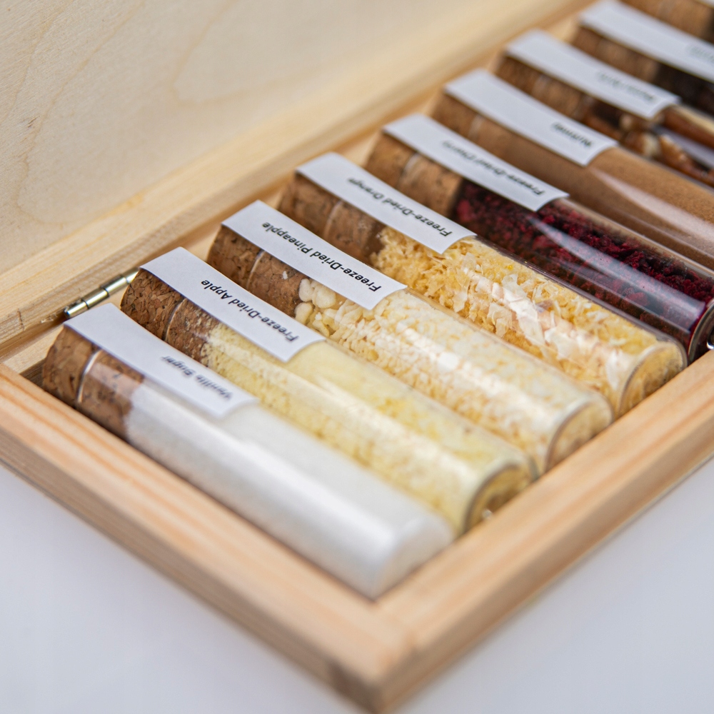 Każda fiolka posiada korkową zatyczkę, która chroni aromat i świeżość przypraw. Całość umieszczona jest w solidnej, estetycznej drewnianej skrzyneczce, idealnej do przechowywania i ekspozycji zestawu.