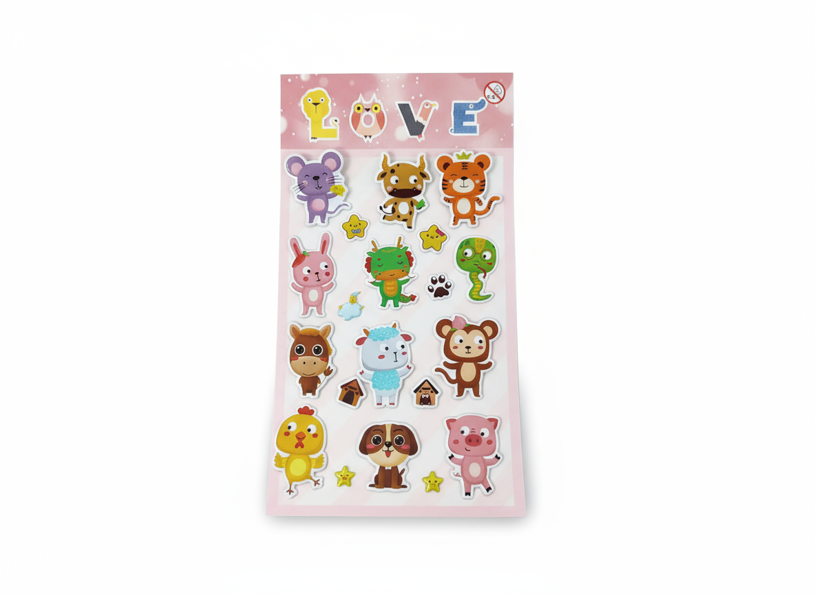 W komplecie znajduje się arkusz uroczych naklejek przedstawiających różne zwierzątka i postacie - m.in. tygryska, króliczka, smoka, małpkę, pieska czy kurczaka. Idealne jako dodatek pobudzający kreatywność.