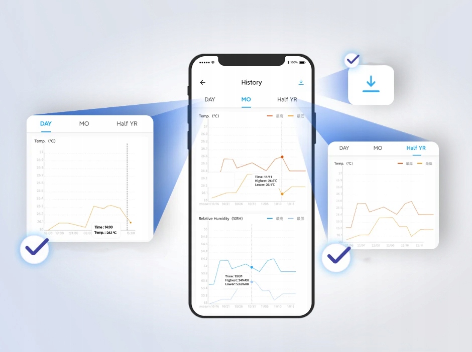 W aplikacji eWeLink otrzymujesz możliwość pełnego podglądu pomiarów. Urządzenie oferuje wykresy godzinowe, dziennie miesięczne (do pół roku).