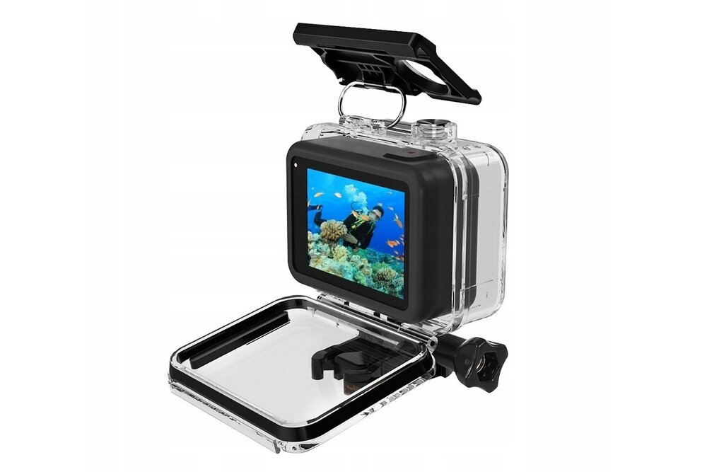Zamontowanie obudowy na kamerze jest bardzo proste oraz intuicyjne. Aby umieścić sprzęt w obudowie, wystarczy odbezpieczyć górny przycisk i otworzyć ją, zamknąć i zapiąć klips. Montaż przebiega bardzo sprawnie i nie będzie stanowił problemu dla żadnego użytkownika.