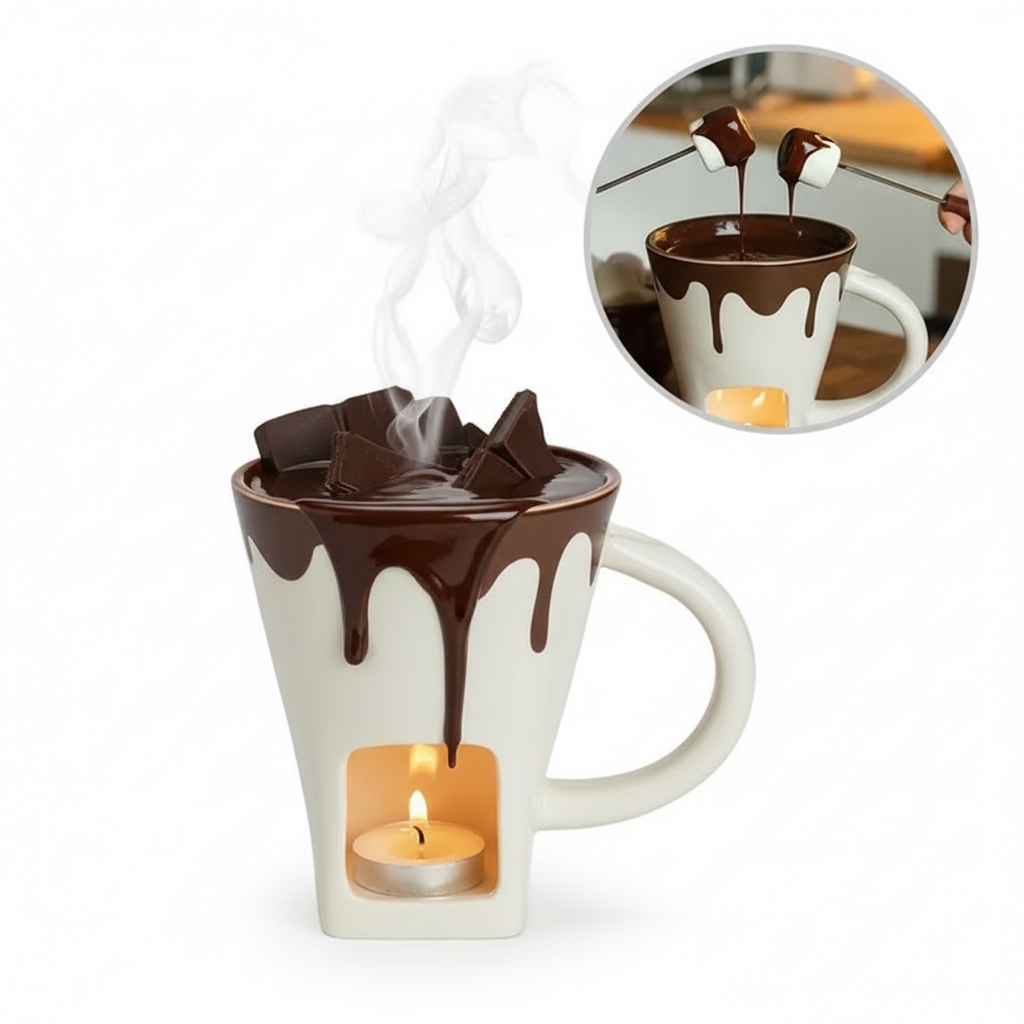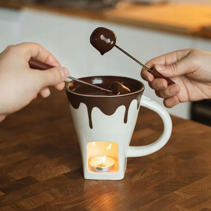Do kubka wkładasz kawałki czekolady, pod spodem zapalasz małą świeczkę typu tealight, a ciepło świeczki delikatnie podgrzewa kubek i topi czekoladę. Dzięki temu możesz maczać w niej owoce, pianki, ciastka albo cokolwiek innego, co kochasz w wersji „oblane czekoladą”.