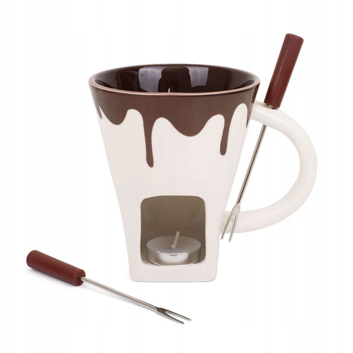 Ten zestaw ma też widelczyki, żeby wygodnie nabijać kawałki jedzenia i zanurzać w roztopionej masie. Kubek jest ceramiczny, więc równomiernie trzyma ciepło i wygląda estetycznie na stole.