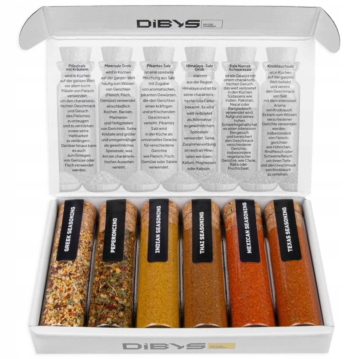 Szklane fiolki ułatwiają dozowanie i estetycznie prezentują się w kuchni. Całość zapakowana jest w poręczny kartonik z atrakcyjną grafiką.